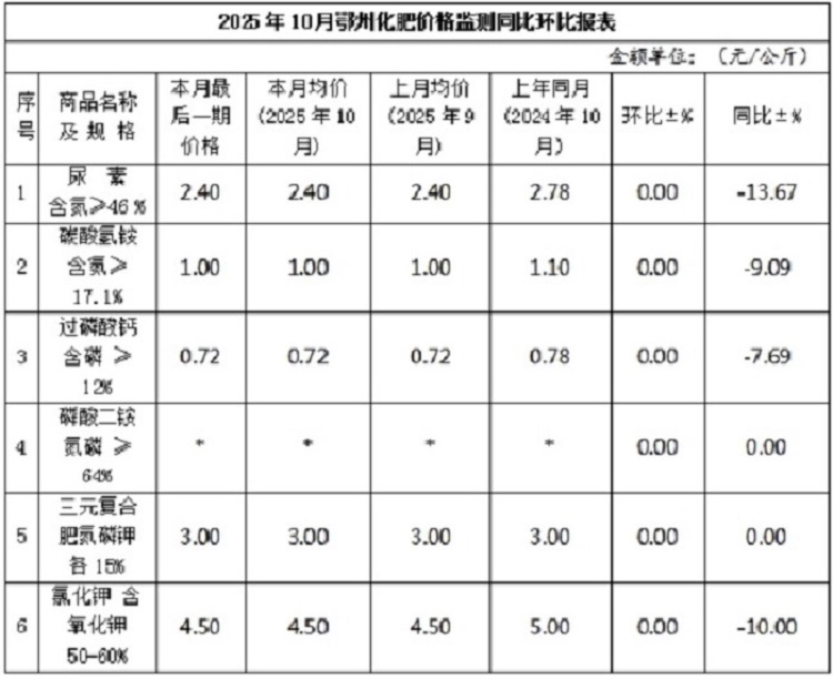 2025年10月鄂州农药、农膜价格监测同比环比报表 |