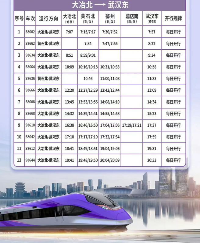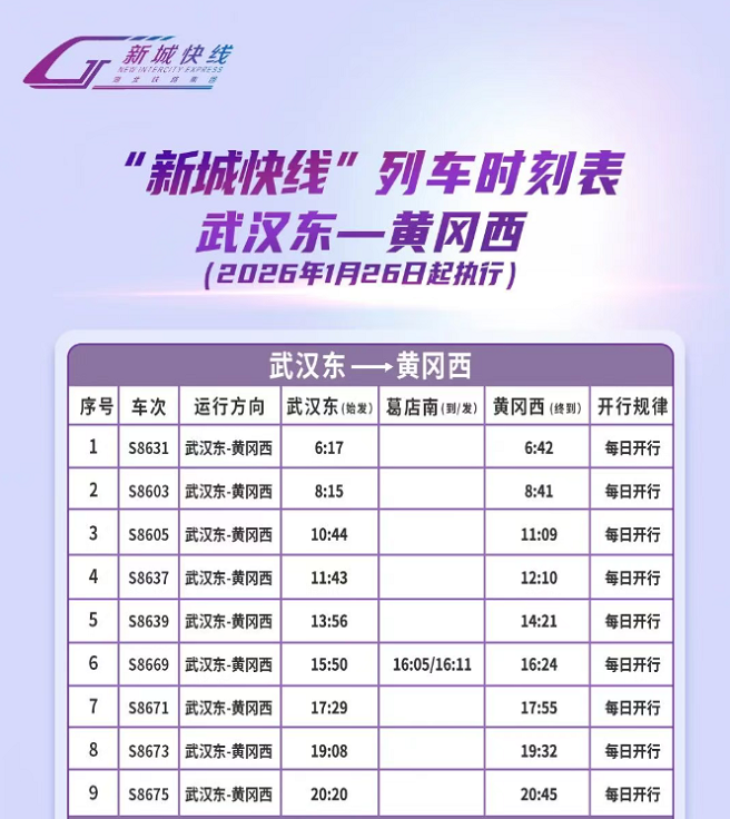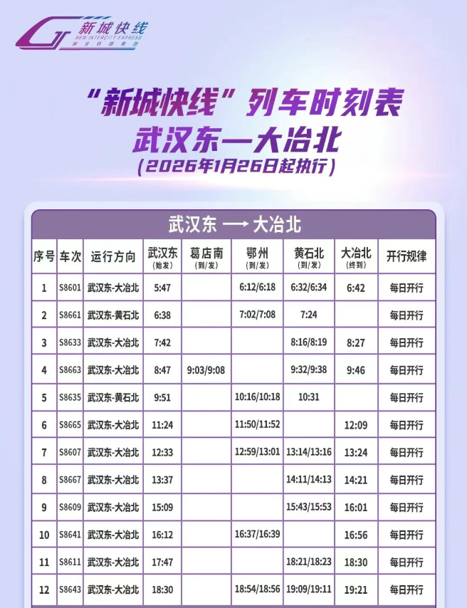 具体详情请随时关注“湖北铁路集团轨道运营有限公司”微信公众号,线上实时查询支付宝、微信“新城快线乘车码”小程序中列车开行信息,请关注车站列车开行公告。