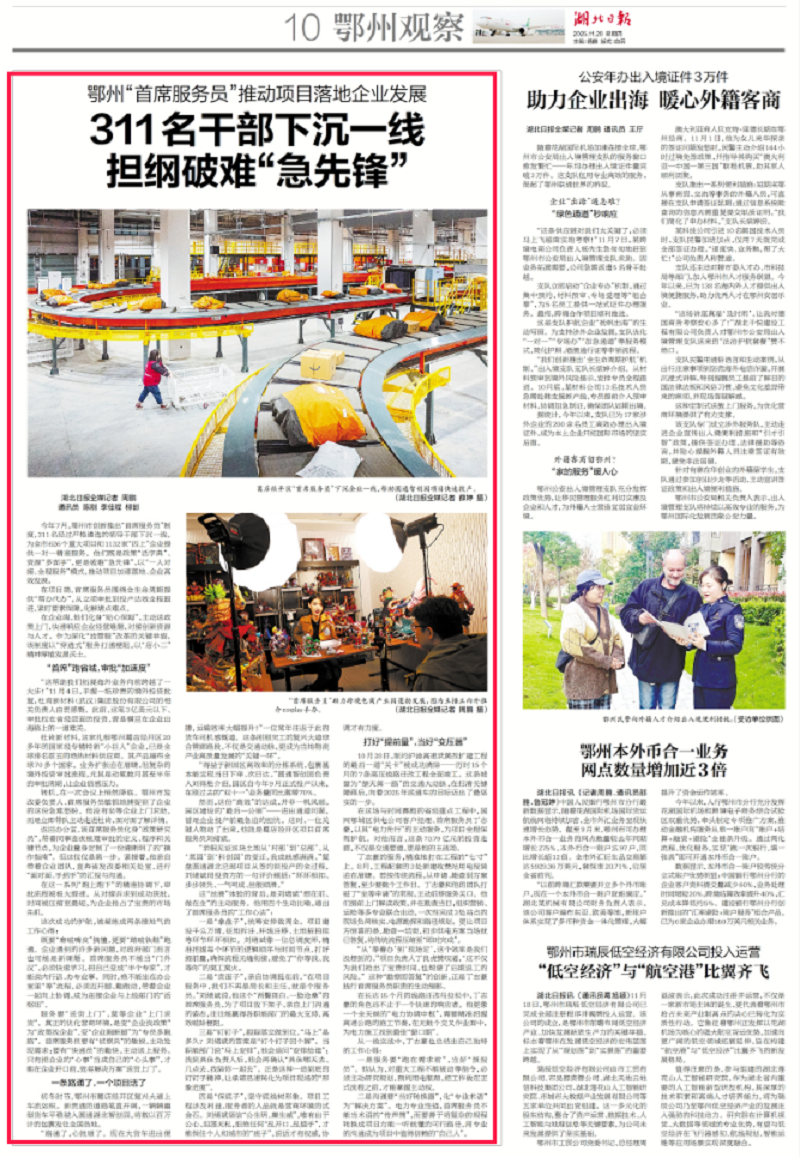 今年7月,鄂州市创新推出“首席服务员”制度,311名经过严格遴选的领导干部下沉一线,为全市626个重大项目和1132家“四上”企业提供一对一精准服务。他们既是政策“活字典”、资源“多面手”,更是破难“急先锋”,以“一人对接、全程服务”模式,推动项目加速落地、企业高效发展。